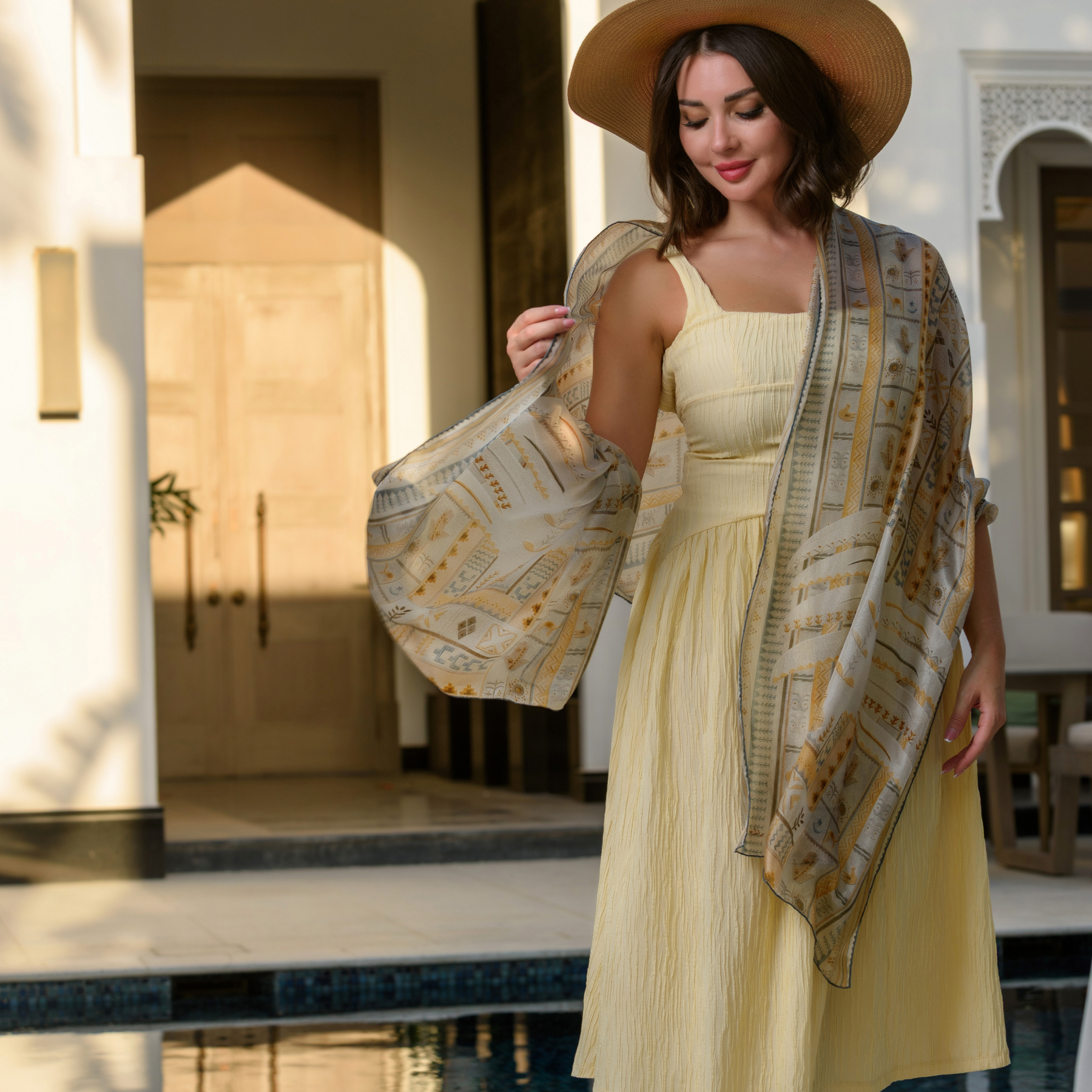 This light and airy piece brings with it a chic and distinct add on to any look. A feminine piece, in essence, the Annada Long Scarf in Silk Voile is the ideal ‘classic’ throw on.