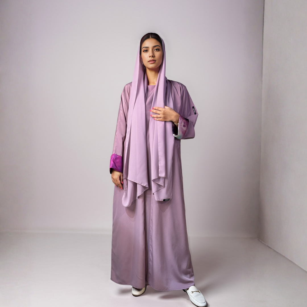 The Touch of Art Abaya is crafted from lightweight crepe, featuring silk artwork delicately placed on its cuffs. Elegant yet versatile, it flows effortlessly from day to night, a perfect balance of modern design, comfort, and artistic expression.