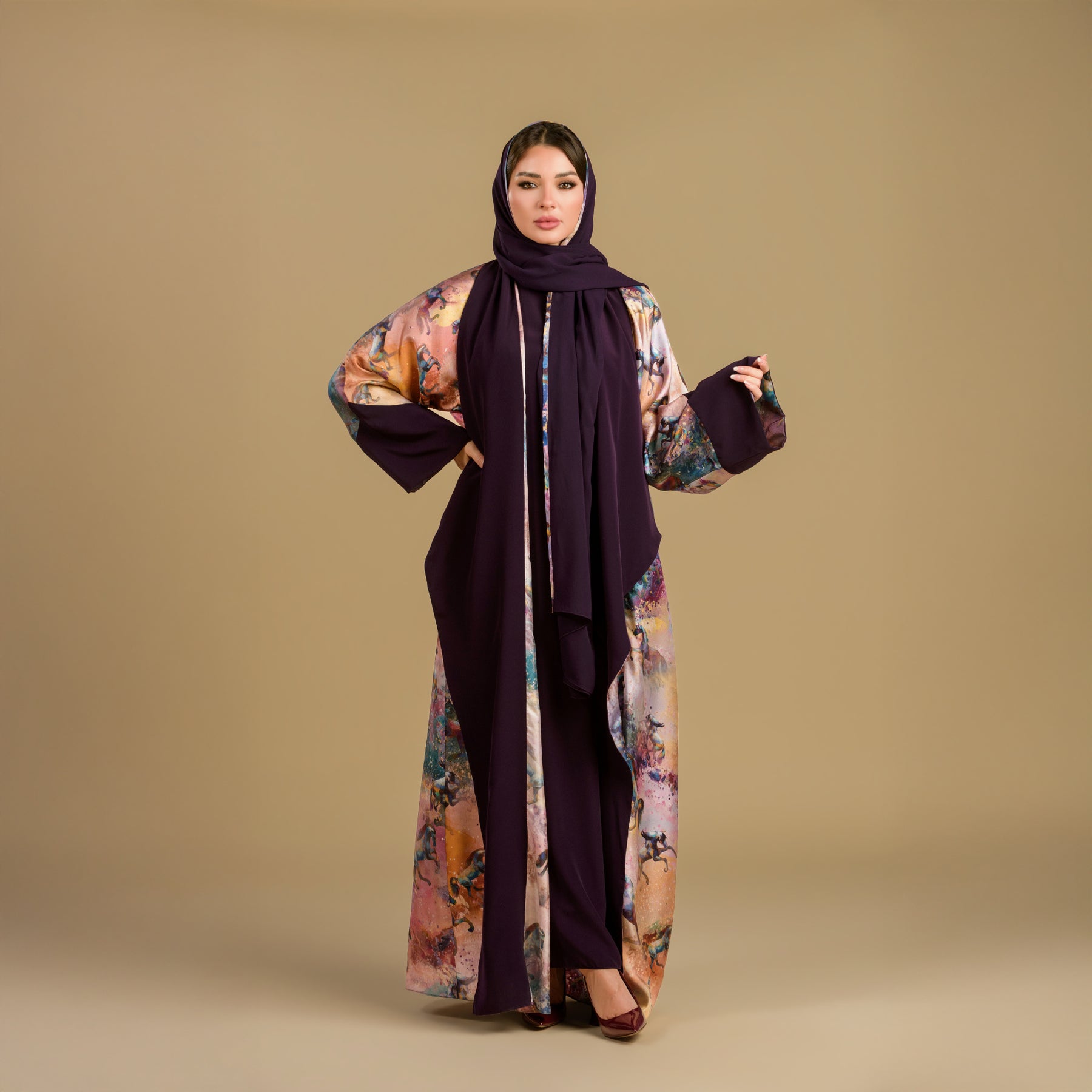 The Draped Abaya in Full Art is designed for the art lover who always wants to make a statement. A wearable canvas of art in the finest silk, It possesses a draped neckline that flatters any shape.