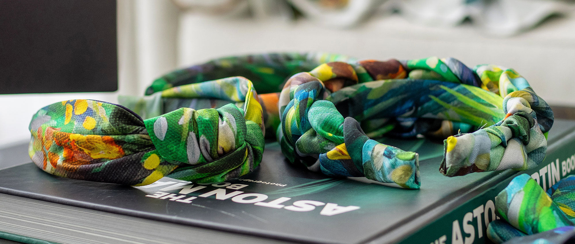 The Annada Mini Scarf brings further flexibility and creativity into styling for a small silk piece. From the classic neckerchief, it evolves into bag wraps, bracelets, head and hat bands or even a camera strap.
